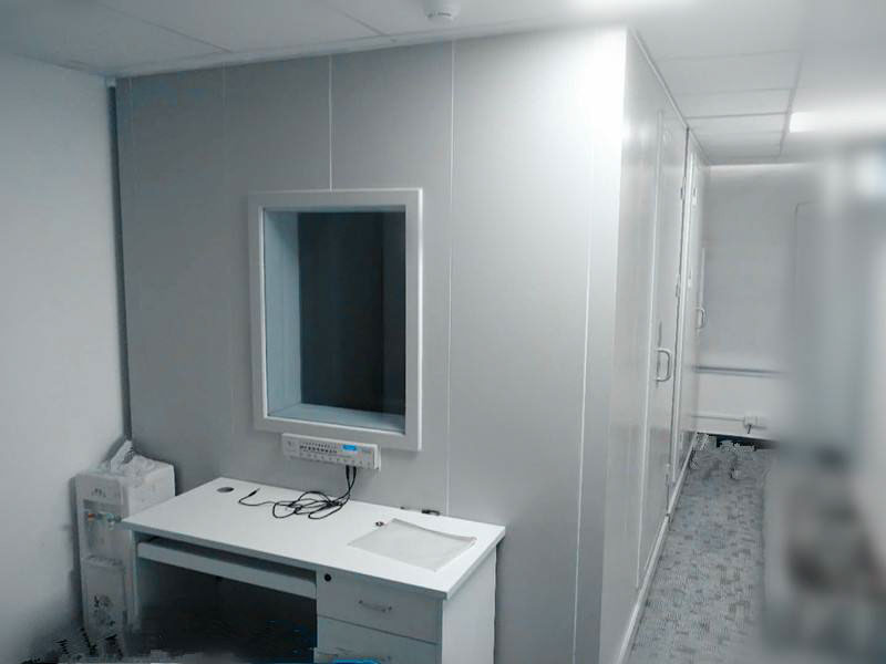 隔聲門:齊平安裝凸輪提升合頁,磁性密封,隔聲門板的內外棉使用冷軋鋼板制造,門側、門頂與門框裝有兩套詞性壓縮密封帶,當門處于關閉位置時形成隔聲環。門板底部是在門關閉時能使門緊壓地板的重力作用密封條,不采用門檻式密封。隔音窗為具有壓力密封的鋁型材窗框結構,使用雙層夾膠安全玻璃窗。接線系統、照明系統、通風系統都會按照客戶要求而配置。