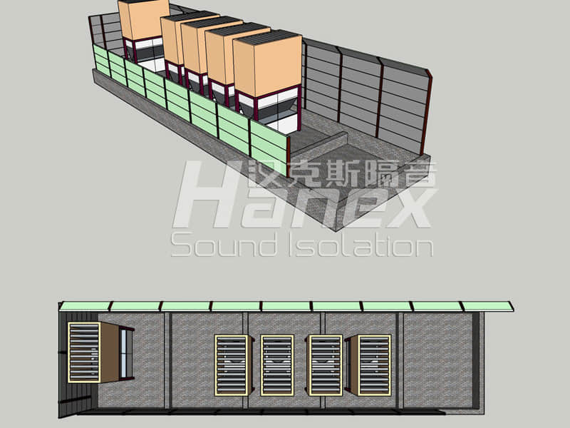 安裝出風(fēng)消聲器后,設(shè)備出風(fēng)口噪聲大幅度的降低,為進(jìn)一步提高降噪效果,同時(shí)保障設(shè)備正常運(yùn)行,在設(shè)備的北面與西面安裝高3.5米的吸隔聲屏障。設(shè)備的南面安裝高1.5米的聲屏障。屏障采用H型鋼立柱,安裝在女兒墻上。